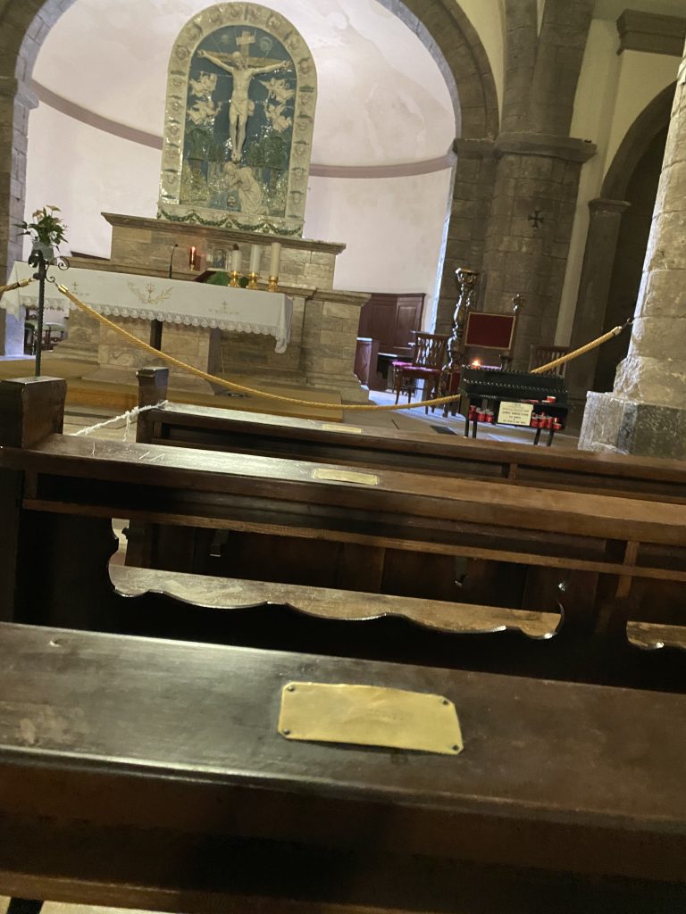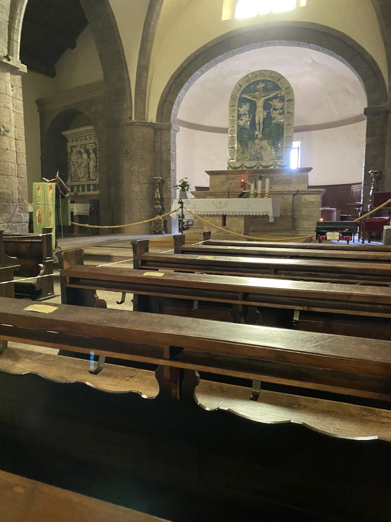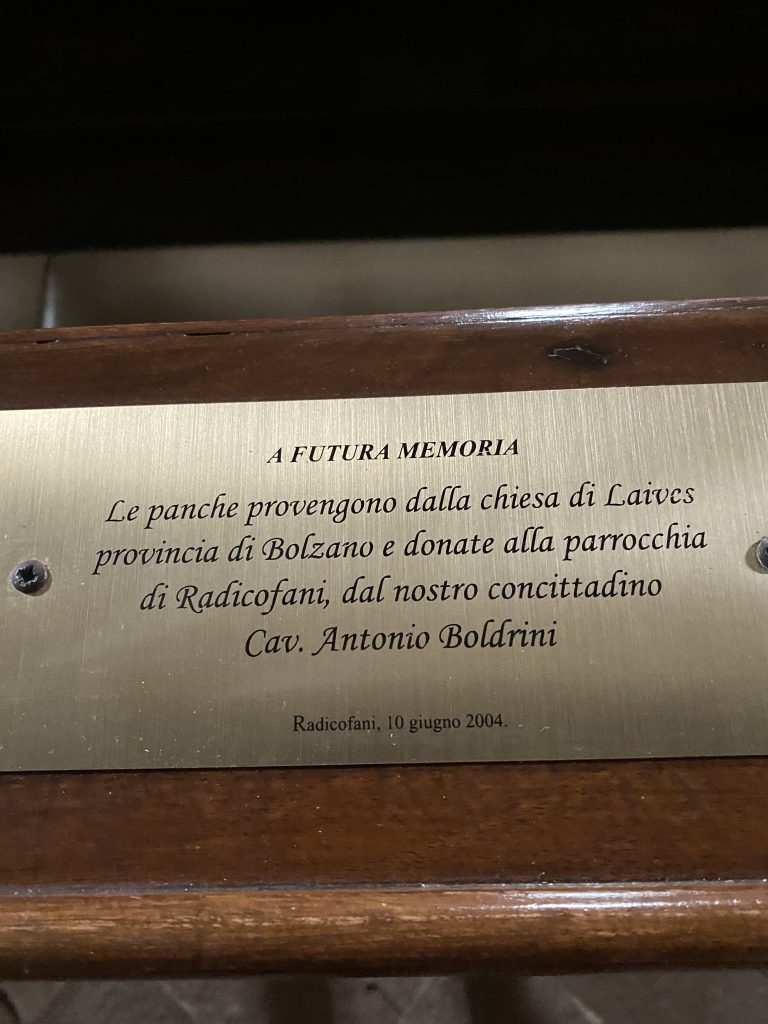 Entrati in chiesa, abbiamo notato subito, che le panche della chiesa avevano dei nomi molto famigliari a noi Bolzanini, e così abbiamo chiesto ad un abitante di Radicofani il perché, e fu così che abbiamo scoperte che quelle panche derivano effettivamente da Bolzano, precisamente della chiesa di Gries ( una frazione di Bolzano). In tempi non molto lontani la chiesa di Gries, ha cambiato le panche e le ha donate alla chiesa di Leives (sempre provincia di Bolzano). Il prete di Laives a sua volta, informo un suo concittadino di Laives, che nel frattempo si era trasferito a Radicofani, che cera la possibilità di avere queste panche visto che quelle della chiesa di Radicofani erano ormai da buttare. E fu così che da Bolzano , passando per Laives le panche sono giunte a Radicofani e dove visitatori di tutto il mondo, possono ammirarle ancora in perfette condizioni.