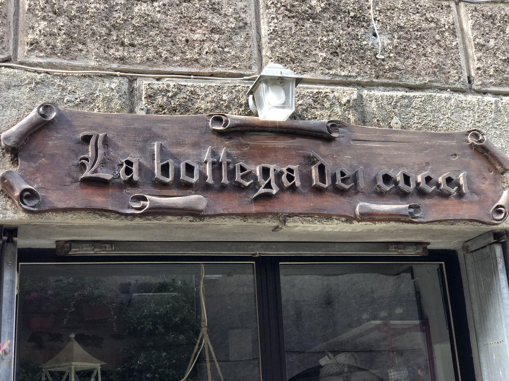 Una volta usciti dalla chiesa, con così tanto stupore, ci siamo diretti verso un piccolo piazzale ( la Piazzetta del Teatro) circondato da case medievali, curatissime. In un angolo abbiamo visto un negozietto con su scritto “Pane e Companatico”, fuori due sedie sotto un tetto di legno, decorato con fiori. Ci bastò uno sguardo per capire che ci saremo entrati, prima per la meravigliosa presentazione di questo posticino e la curiosità di vedere come sia fatto dentro, secondo per comprare qualcosa da mangiare, perchè incominciavamo ad avere fame.
